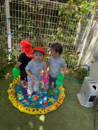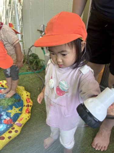 保育者がタライの中のお水を増やしたり、ミストをしていると、あれあれ!お友だちが先生みたいになってる😆🧡