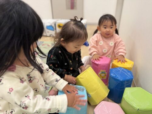 「ピンクは❓青は❓」と、柱の色で音が変わるんじゃないかと丁寧に叩いて確認していくあひる組さんたち🦆みんなでトントン叩く姿はとても可愛かったです🥰