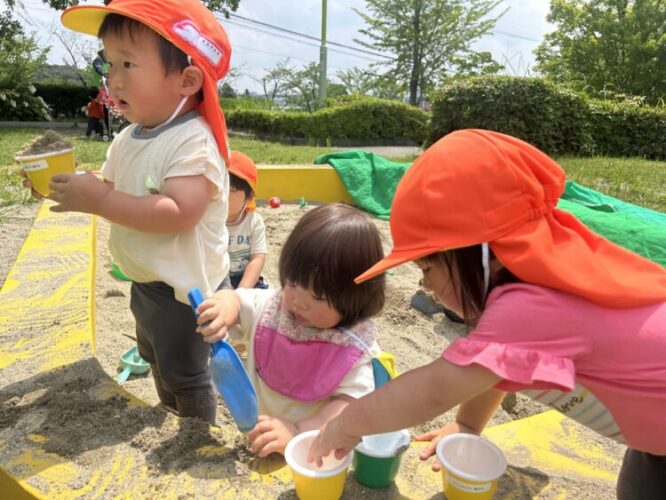 カラフルなカップにお砂を入れて、まぜまぜして、アイスクリーム屋さんができていました🍨♡ 「はい、どうぞ!!」