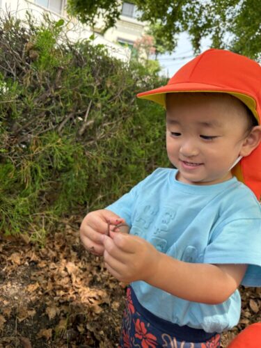 「ミミズさん見つけたよー!!」とニコニコでお友だちや保育者に見せてくれました!ダンゴムシも見つけていましたよ!!