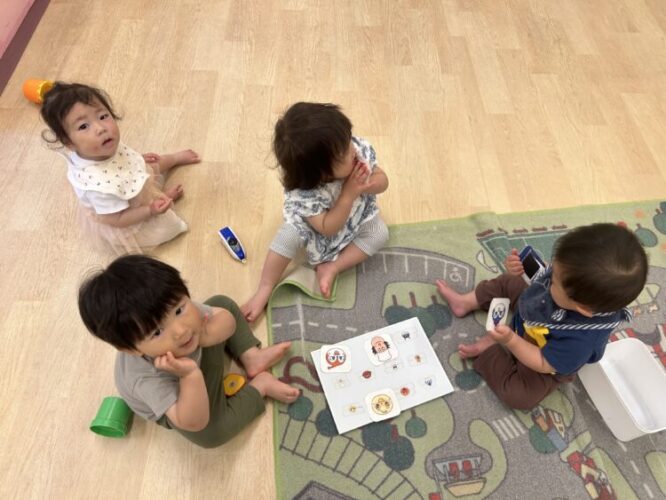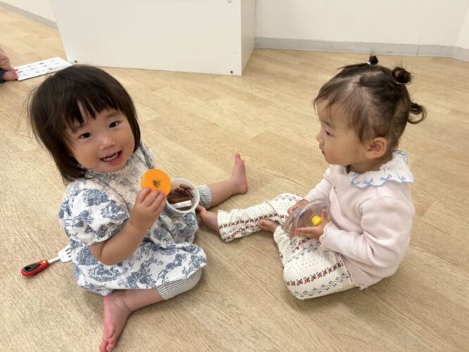 0歳のお友だちと1歳のお友だちが一緒に仲良く遊んでいましたよ
