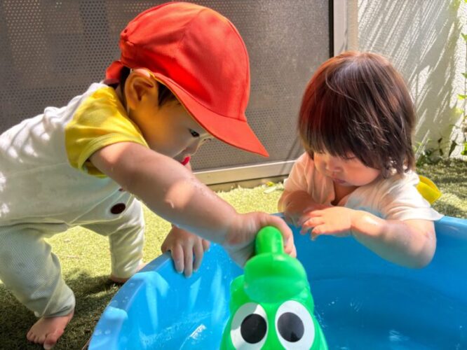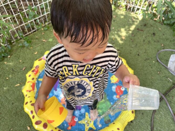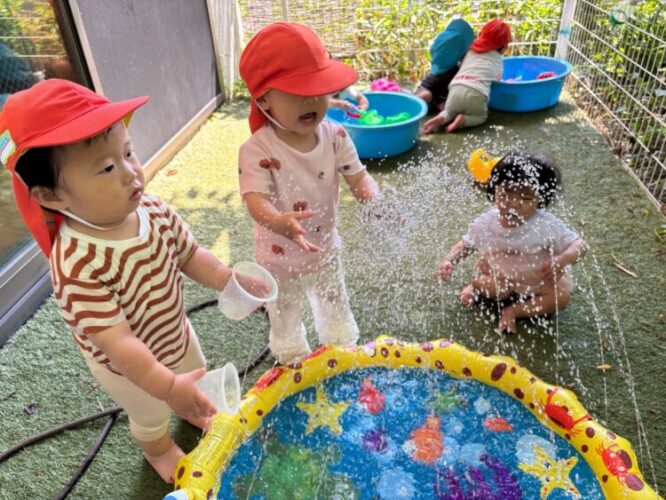 保育者が「お水じゃぶじゃぶしに行く人ー!」と声をかけると「はーい!!」とお返事してくれます😆中には自分でカラー帽子を被って準備万端で待っているお友だちも🥰