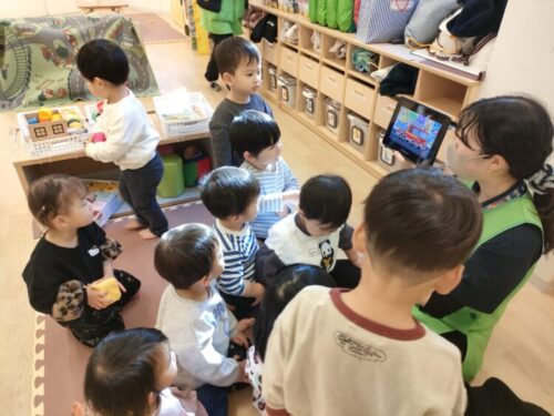 散歩が終わったらEnglish Timeです👀みんなが大好きな「Here Comes The Fire Truck」という消防車の動画が流れると、「消防車さっき見た‼️」と大盛り上がりでした😊