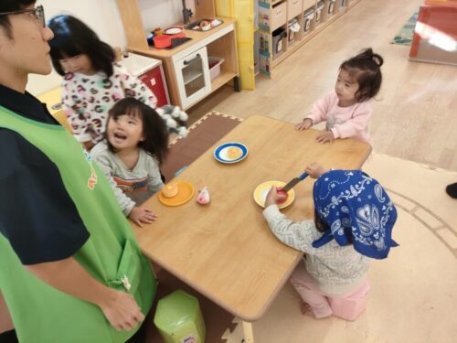 朝のおやつの前にみんなでおままごとをして遊びました✨「青いの先生の❗️」とパンケーキをくれる優しいあひる組さん🥰包丁を使ってトマトを上手に切るひよこ組さん🐣「切ったとこ見てた⁉️」と言わんばかりに自慢げな顔を見せてくれました😊