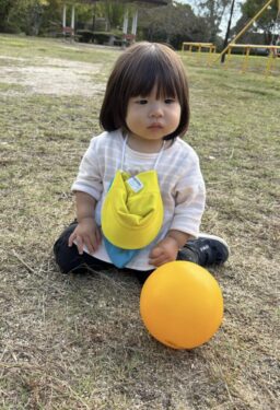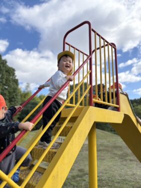 ボール遊ぶも落ち着き、大きなすべり台で遊ぶことに👀「落ちないように両手で持ち持ちするよ‼️」の約束をしっかり守って、高ーい階段を登っていきます💪