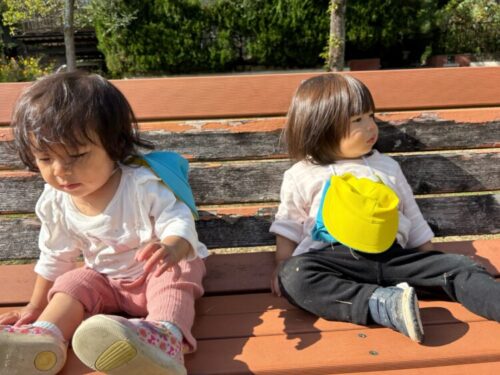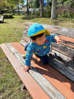 すべり台に大はしゃぎなあひる組さんたちを横目に、ひよこ組はベンチで遊びます🪑よいしょと自分で登って、未知の場所を探検です🔍