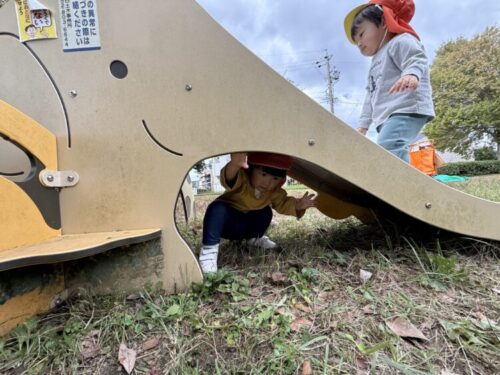 すべり台で遊んでいると、きりんくま組さんも公園に遊びにきました🦒🐻「ねぇね来たよ❗️」と保育者が伝えると、嬉しそうな顔で手を振っていました👋この後は、お兄さんお姉さんたちと一緒に遊びました✨