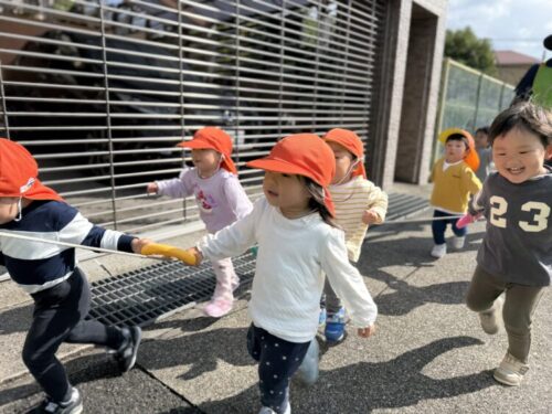 公園の帰り道の途中、前方にうさぎ組さんの姿が🐰「待て待てする❓」と聞くと、「する‼️」と元気にお返事☺️うさぎ組さんに追いつくために、「待て待て〜」と、みんなで小走りで帰りました🏃♂️💨
