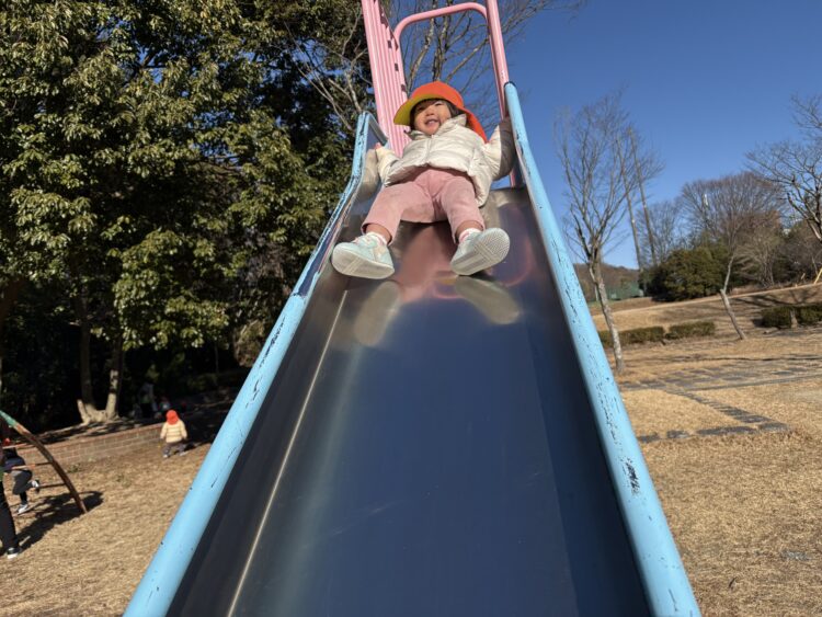 あひるさんは裏山公園に行きました‼️元気に滑り台ビューン🛝冷たい風に向かっても元気いっぱいです!