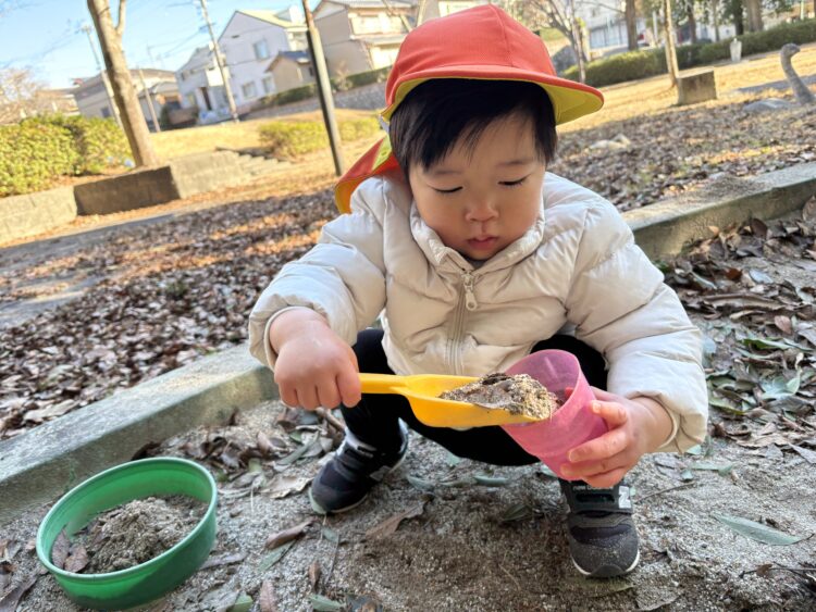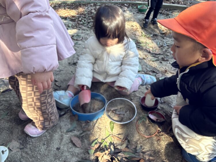 こちらはお砂場で、お弁当作り🍱「ふりかけどうぞー」「ブルーベリーのふりかけです」「いちごのスープできたよー」など子どもたちの発想がとても素敵でした💓