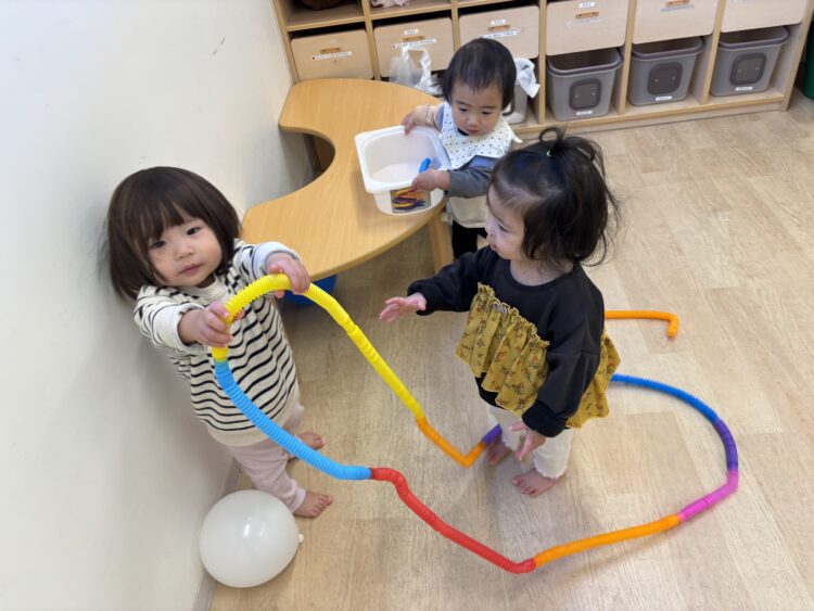 新しいおもちゃが入りました😆カラフルな色のポップチューブ🌈つないでみると大きな輪っかになったね😆ビョーン♬ビョーンとおもしろい音がするね😆