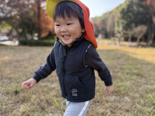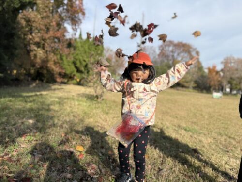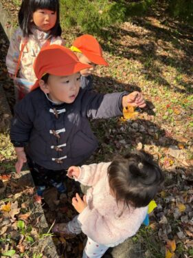 裏山広場に落ちてるたくさんの枯葉を集めて落ち葉シャワーをしました🍁「見ててねいくよ❗️それー‼️」と両手に持ったいっぱいの落ち葉を放り投げます😊