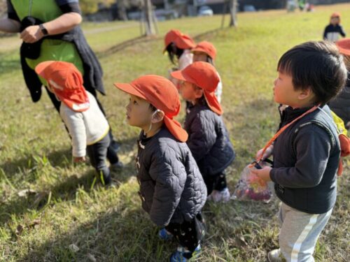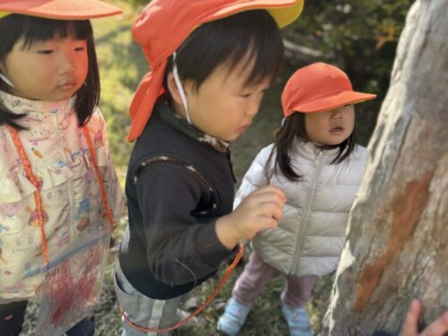 「木の皮の裏に虫さんが隠れてるんだよー」とお話しすると、そこからはみんなで虫探し大会です🔍じっくり観察したり、木の皮を捲ったりして虫を探すあひる組さん🦆羽アリや蜘蛛を見つけることが出来て、嬉しそうな様子でした✨