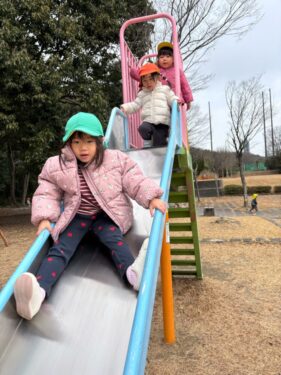 裏山公園に着くと、さっそく大好きなすべり台へ🛝お兄さんお姉さんに混ざって、しっかりと順番を守ってすべり台を遊んでいきます💪