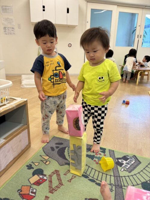 お部屋で、お友だちと一緒に牛乳パックのブロックを積み上げることを楽しんでいました