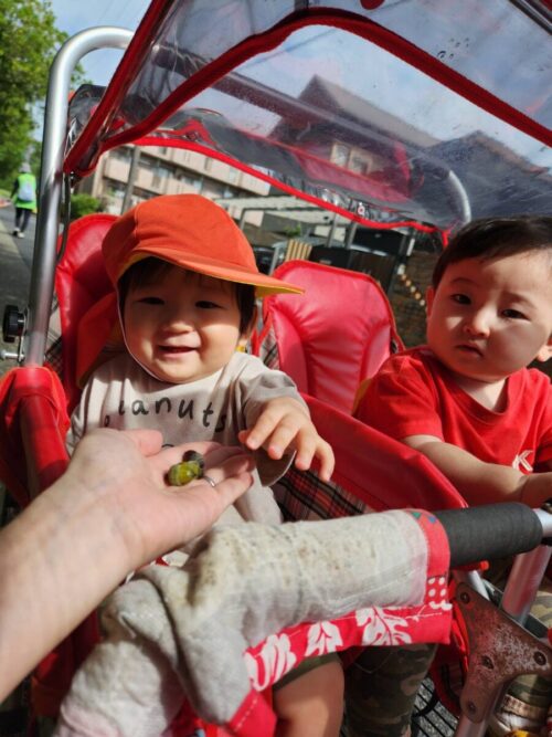 どんぐりを発見💡保育者が見せると嬉しそうに触っていましたよ