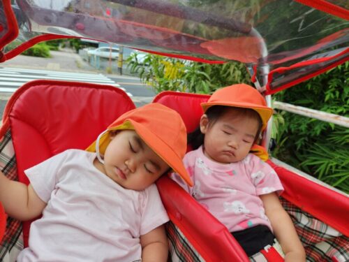 行きは柿の実や大きな葉っぱが色づいているのを見て大興奮だったお友だちも、帰りの散歩車の中では揺れが心地よく、夢の中へ…