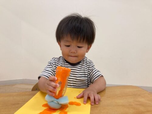 初めての絵の具に興味津々で、みんな楽しそうにポンポンとしていましたよ![]()