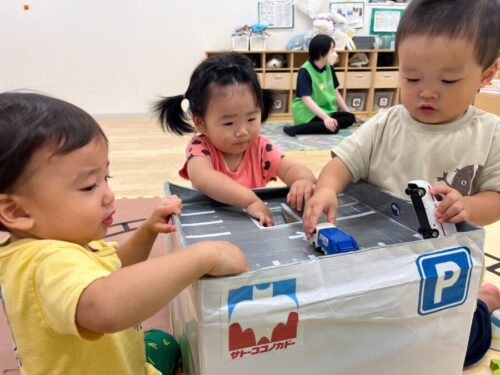 あひる組のお友だちとひよこ組のお友だちで仲良く車で遊んでいました