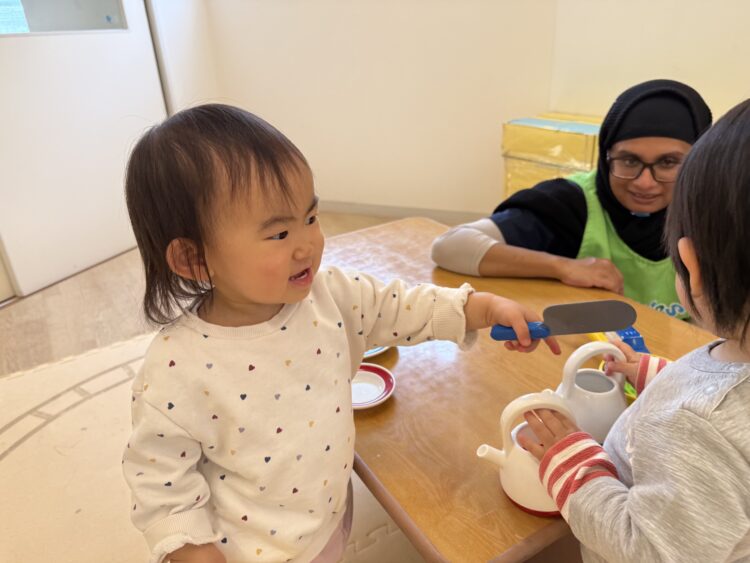 お友だちと「あーん!」と順番に食べ物をあげてやりとりするあひる組の姿も![]()