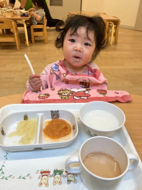 離乳食を食べてご機嫌なひよこ組のお友だち🐥保育者とたくさんお話ししながらにっこり笑顔で食べていました![]()