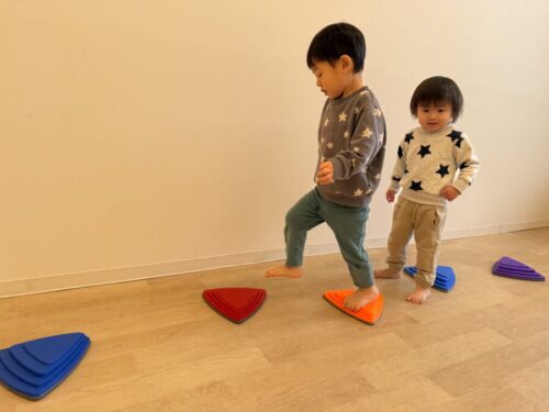 「あか!オレンジ!」と色を言いながらバランスストーンに乗って楽しむお友だち![]()