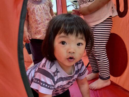 消防車のテントから、いないないばぁ😆をするお友だち![]()