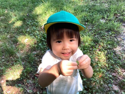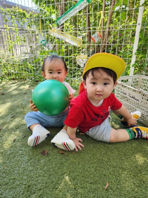 ほいくしゃの真似をしてボールを「ポーン」と投げて見たり、テラスに落ちて来た枯れ葉をクシャクシャと手で握ってみたり。