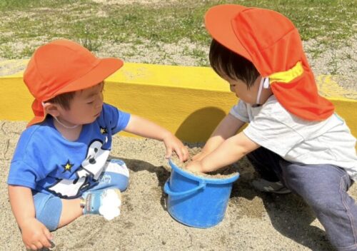 バケツに手を入れて砂の感触を楽しむお友だち![]()