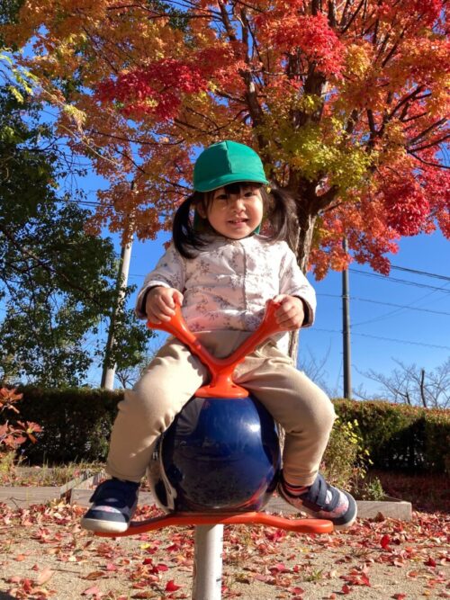 とっても綺麗な紅葉をバックに遊具を楽しむお友だち![]()