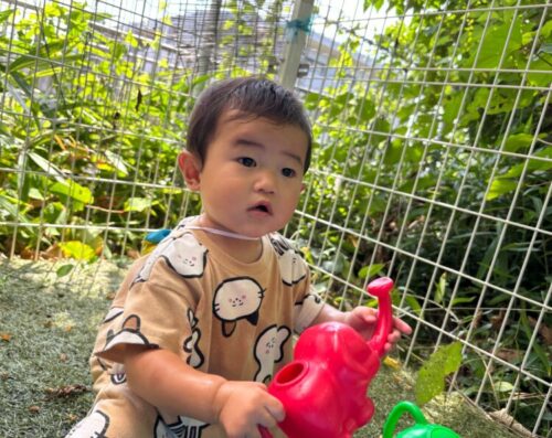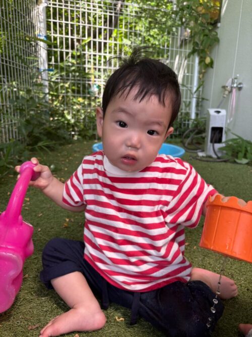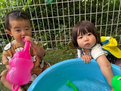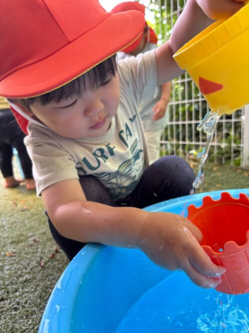 ひよこぐみも、あひるぐみと一緒にお水遊びをしてスッキリしましたよ🌼お水がへっちゃらで、タライに手を入れてジャバジャバ!と水の音や感触を楽しんでいました🎵