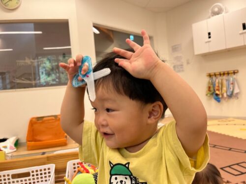 「チョキチョキ✂️」と髪の毛を切る真似っこをしているお友だち![]()
