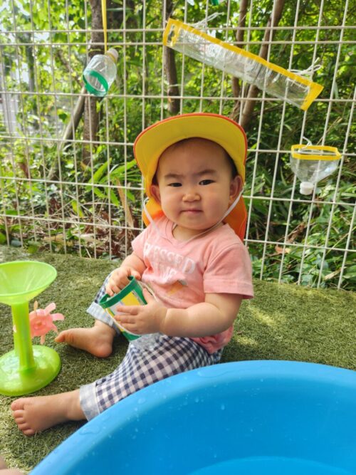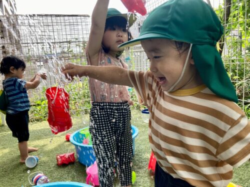 ペットボトルシャワーや、ジョウロの水がかかるのをキャッキャとはしゃぎながら楽しむお友だち![]()
