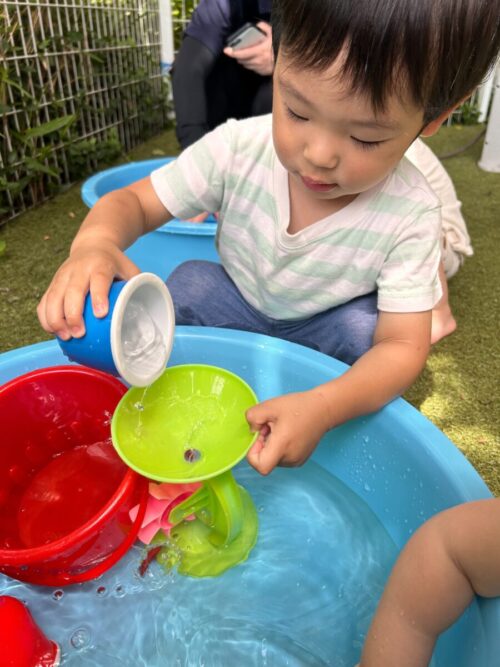 コップで水をすくってジャーと流し、くるくる回るのを見て繰り返し楽しんで遊んでいました