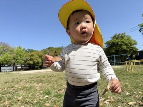 葉っぱを拾って「っぱ!」と保育車に見せているお友だち![]()