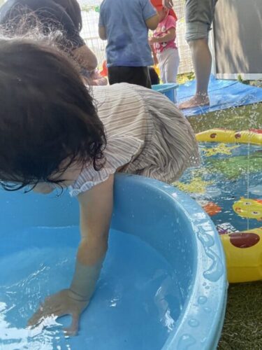 タライの水に興味津々のお友だち😆
