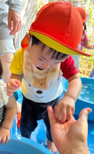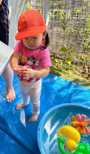 「冷たいねぇ」と感触を楽しむお友だち😄