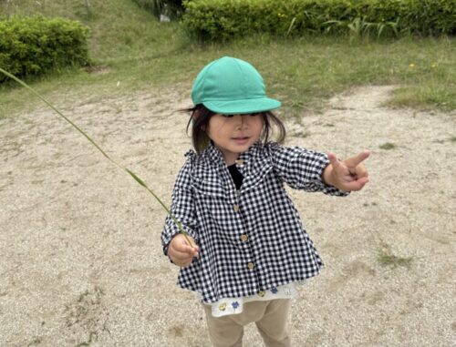 手に猫じゃらし。「何持ってるの?」と聞くと
