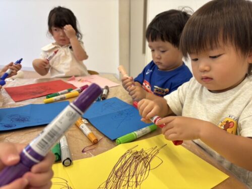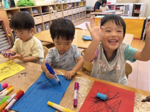 プールが終わった後は、夏祭りに使う財布を制作します👀好きな色の画用紙とペンを使って財布に柄を描いていきます✨みんな真剣な表情で取り組んでいました👏