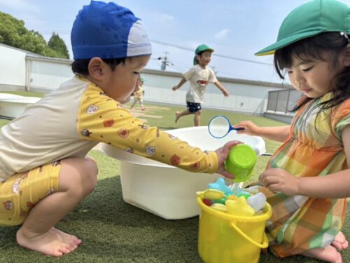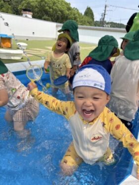 遂にプールの時間が来ました🩳最初からテンション最高潮のうさぎ組🐰水の感触を楽しみながらみんなでバシャバシャ💦