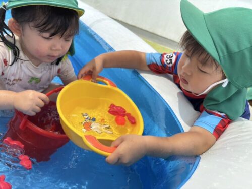 バケツや桶を使って魚獲り🐟「見てみてとれたよ‼️」と、お友だちと見せ合いっこしていました☺️