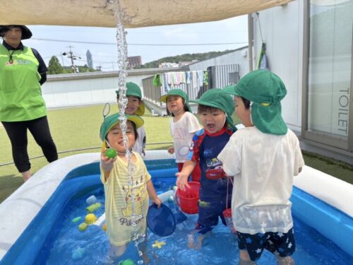 先生からのシャワー攻撃🚿「キャー‼️」と自分から浴びに来たり、「逃げろ〜❗️」と走って逃げたり、「冷たくて気持ちいいね」とお友だちと一緒に喜んだりと大はしゃぎの1日でした☺️