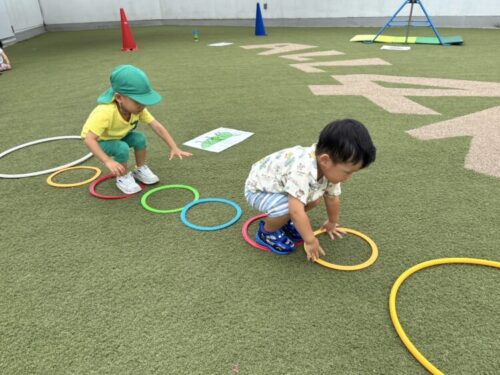 バッタになってフラットフープをぴょんぴょん飛んだり🦗みんな上手に虫さんになりきる事ができました👏