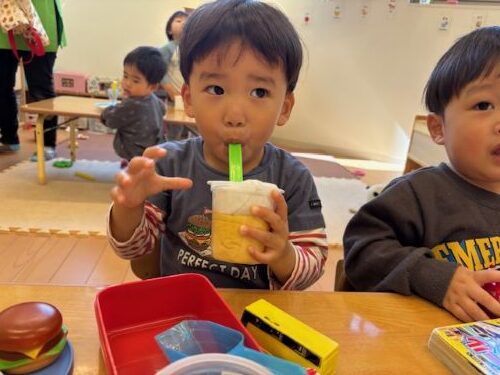 上手にジュースに見立てておままごと遊びを楽しんでいるところをパシャリ📸![]()