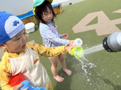 いざ屋上へ🏃♂️💨保育者がシャワーを使って準備をしていると「お水入れてー」と近づいて来た子どもたち☺️勢いよく出るシャワーの感触が楽しいようで、「もう一回‼️」何度もお願いされました😊