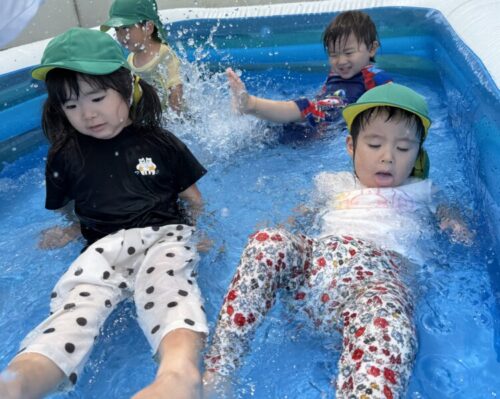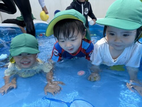 おもちゃがたくさん浮かんでいるプールへ🏊ボールや魚、ペットボトルなど好きなおもちゃを見つけて、それぞれ楽しんでいました💡