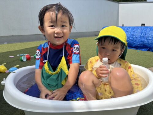 2人で仲良く入浴中🛀「冷たくて気持ちいねー」とお話ししていました🌈いつも夜にお風呂に入っているからか、「夜になったねー」と保育者に教えてくれました🌕