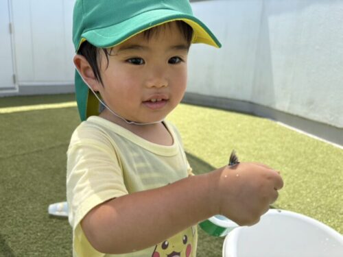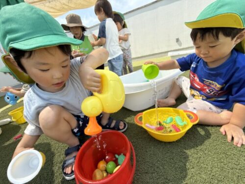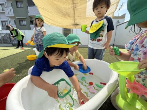 今日の水遊びではおもちゃを水に浮かべて遊びました🐟ボトルやお皿、バケツを使って上手におもちゃを掬っていきます👀