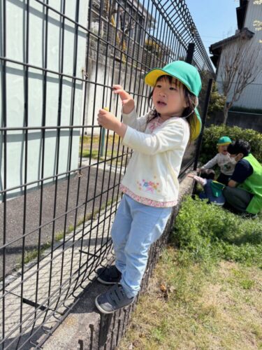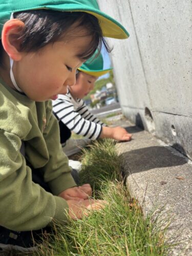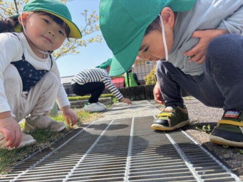 昨日の雨で側溝にお水が溜まっているのを興味津々に覗き込むお友だち☺️