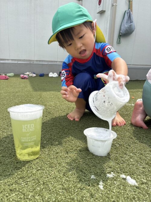 体操教室が終わった後は屋上で水遊び💦今日は保育者が持ってきた魔法の液体であわあわプールを作りました👀コップに入れたり、ジュースにトッピングしたりとお気に入りな様子☺️